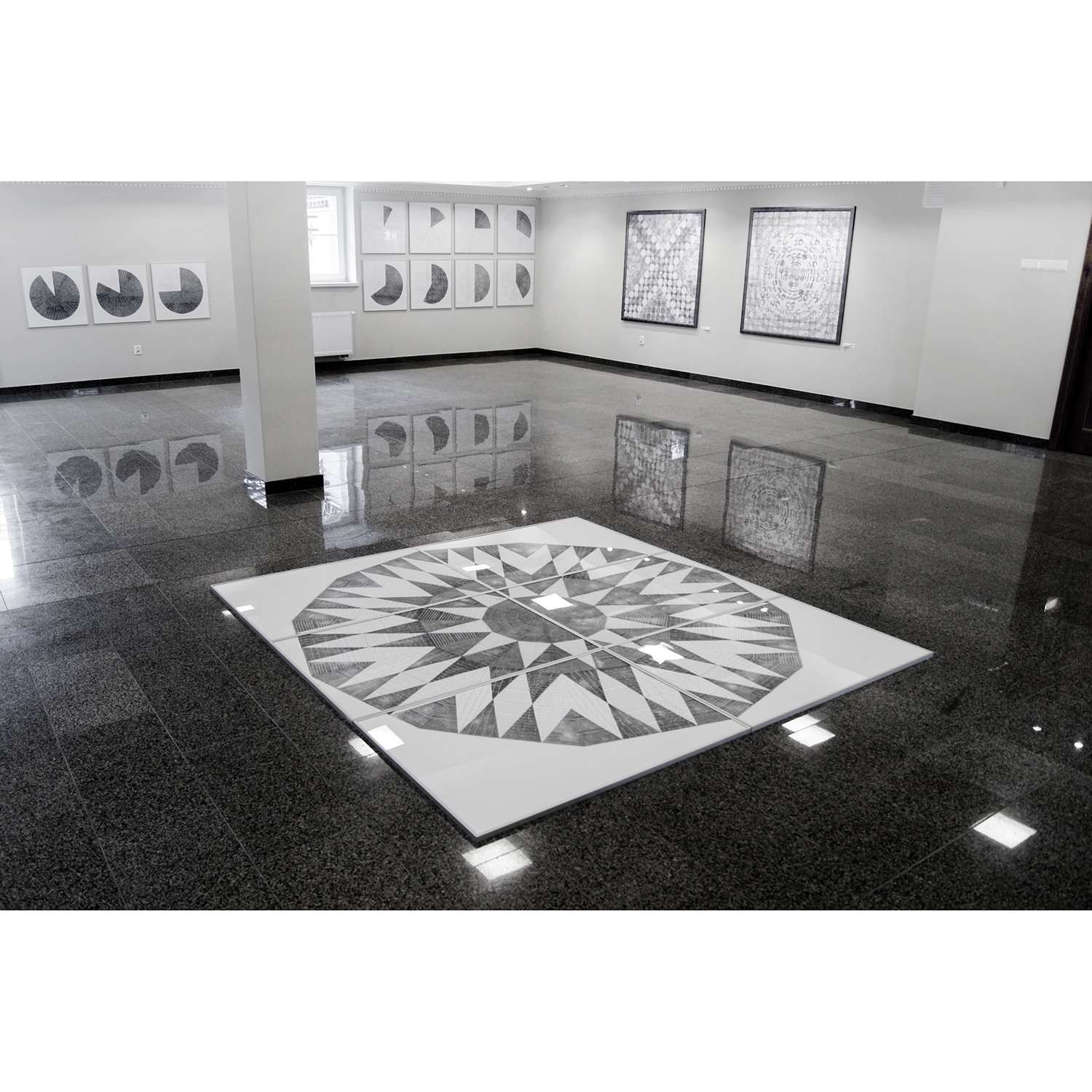 [PL] Wisława Szymborska ("Wczesna godzina"): Śpię jeszcze, a tymczasem następują fakty. Bieleje okno, szarzeją ciemności, wydobywa się pokój z niejasnej przestrzeni, szukają w niej oparcia chwiejne, blade smugi. Kolejno, bez pośpiechu, bo to ceremonia, dnieją płaszczyzny sufitu i ścian, oddzielają się kształty, jeden od drugiego, strona lewa od prawej. Świtają odległości między przedmiotami, ćwierkają pierwsze błyski na szklance, na klamce. Już się nie tylko zdaje, ale całkiem jest to, co zostało wczoraj przesunięte, co spadło na podłogę, co mieści się w ramach. Jeszcze tylko szczegóły nie weszły w pole widzenia. Ale uwaga, uwaga, uwaga, dużo wskazuje na to, że powracają kolory i nawet rzecz najmniejsza odzyska swój własny, razem z odcieniem cienia. Zbyt rzadko mnie to dziwi, a powinno. Budzę się zwykle w roli spóźnionego świadka, kiedy cud już odbyty, dzień ustanowiony i zaranność mistrzowsko zmieniona w poranność. Na wystawie zaprezentowane zostały prace z cyklu „Labirynt“, „24 godziny“ i „Zapisana godzina“.