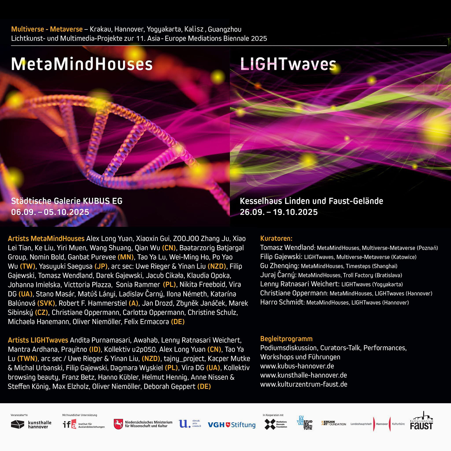[PL] W Projektach: MetaMindHouses i LIGHTwaves ok. 50 artystów z Polski, Niemiec, Słowacji, Czech, Austrii, Ukrainy, Chin, Mongolii, Tajwanu, Japonii, Nowej Zelandii i Indonezji zaprezentowało prace na styku nauki, filozofii i utopii. Nacisk kładziony był na interakcję człowieka z naturą, komunikację i transfer energii. Zwiedzający mogli zapoznać się z projektami multimedialnymi i badawczymi, instalacjami świetlnymi, a także surfować po interaktywnym wszechświecie w cyberprzestrzeni. Program obejmował warsztaty poświęcone wirtualnej i rozszerzonej rzeczywistości oraz zastosowaniom sztucznej inteligencji, panele dyskusyjne, rozmowy z artystami, wycieczki z przewodnikiem dla różnych grup docelowych w Hanowerze. [DE] Die Projekte MetaMindHouses und LIGHTwaves präsentieren mit ca. 50 niedersächsischen und überregionalen Künstler*innen ungewohnte künstlerische Perspektiven im Grenzbereich von Wissenschaft, Philosophie und Utopie. Der Themenschwerpunkt liegt auf Interaktion Mensch/Natur, Kommunikation und Energietransfer. So werden Besucher vor Ort im KUBUS EG und umgebenden öffentlichen Raum sowie auf dem Faust-Gelände Multimedia- und Rechercheprojekten, Lichtinstallationen und -projektionen begegnen und im Cyberspace durch ein interaktives Universum surfen können. Als Begleitprogramm werden u. a. Workshops zu Virtual- und Augmented-Reality sowie Anwendungen mittels KI angeboten. Das umfangreiche Begleitprogramm bietet eine Podiumsdiskussion mit den Kuratorinnen, Artist-Talks, Performances, Workshops und Führungen für unterschiedliche Zielgruppen in Hannover und lädt die Stadtgesellschaft spielerisch ein, zu Akteurinnen statt zu bloßen Konsumenten digitaler und analoger Welten zu werden. KURATORZY WYSTAWY: T. Wentland, F. Gajewski, G. Zhenqing, J. Čarný, L. Ratnasari Weichert, Ch. Oppermann, H. Schmidt.